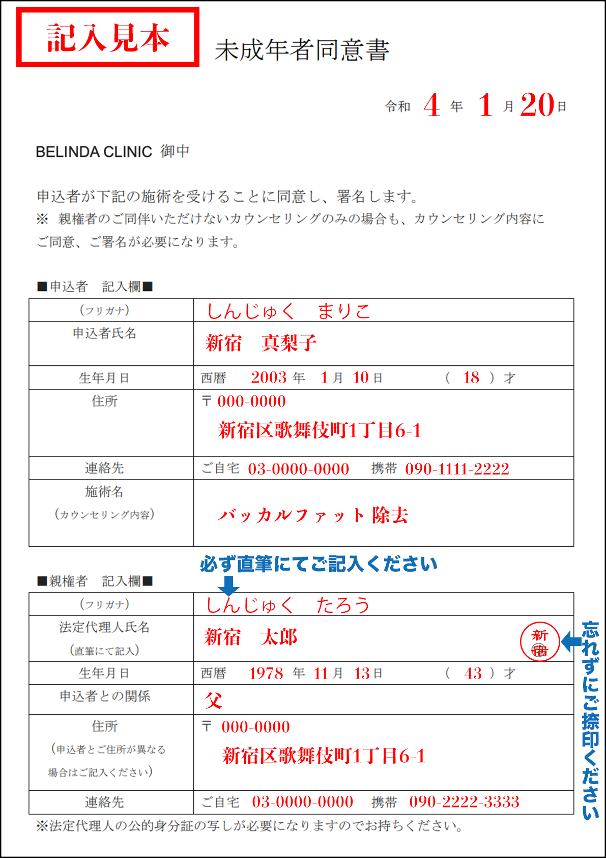 平素はベリンダクリニックをご利用いただきありがとうございます。 2022年4月より、民法が改正され成年年齢が18歳に引き下げとなりました。それに伴い当院での未成年者様のご案内に変更点がございます。 ・18歳以上の方は「未成年同意書」の持参、親権者様の署名・捺印は不要となります。 ・18歳以上の患者様に関する個人情報開示については親権者様であっても、個人情報保護法により一切できません。