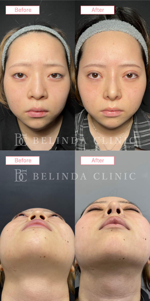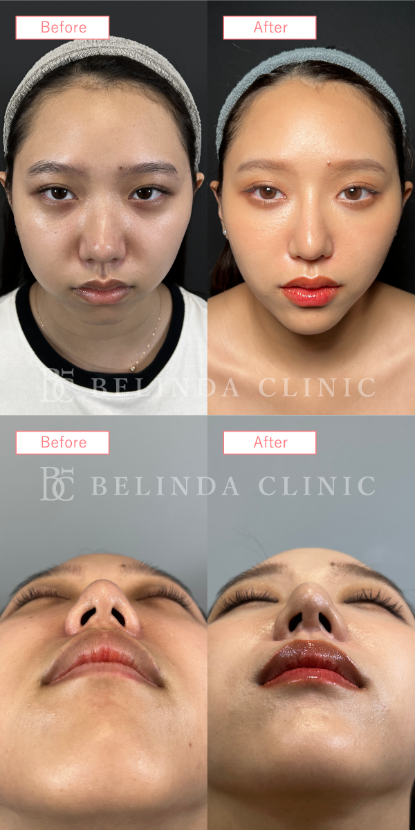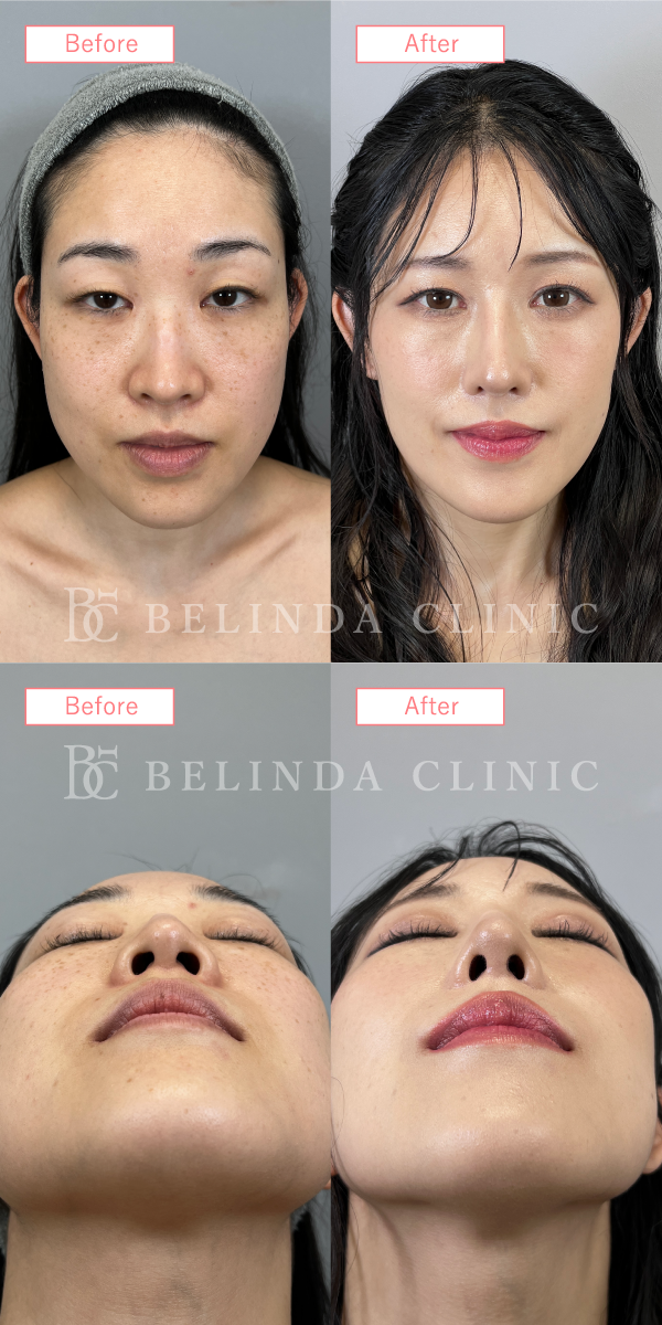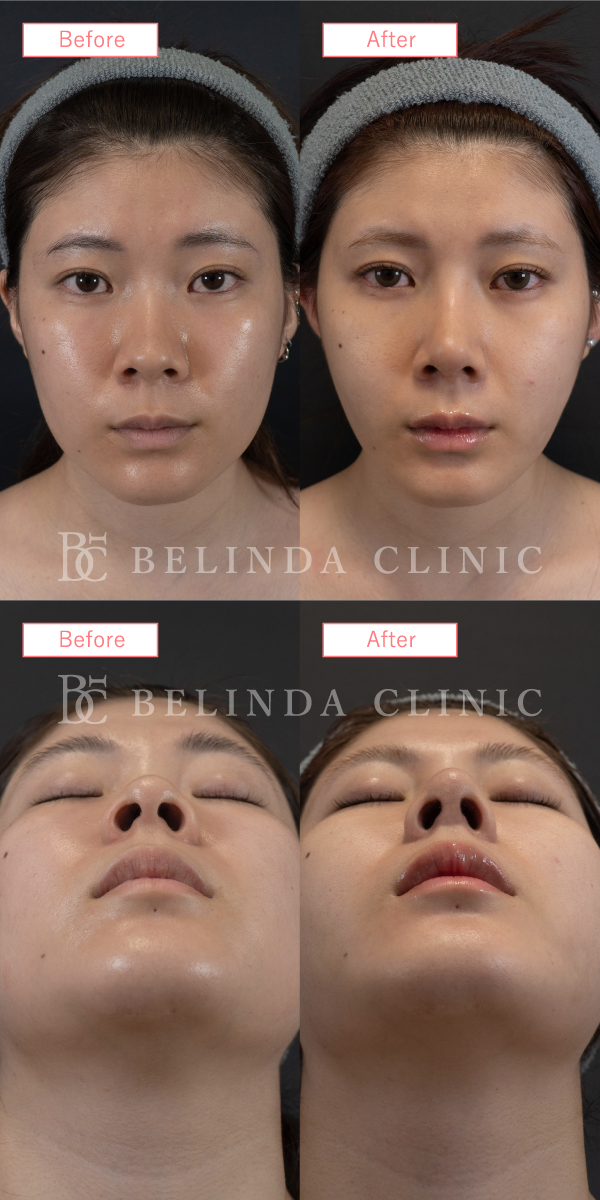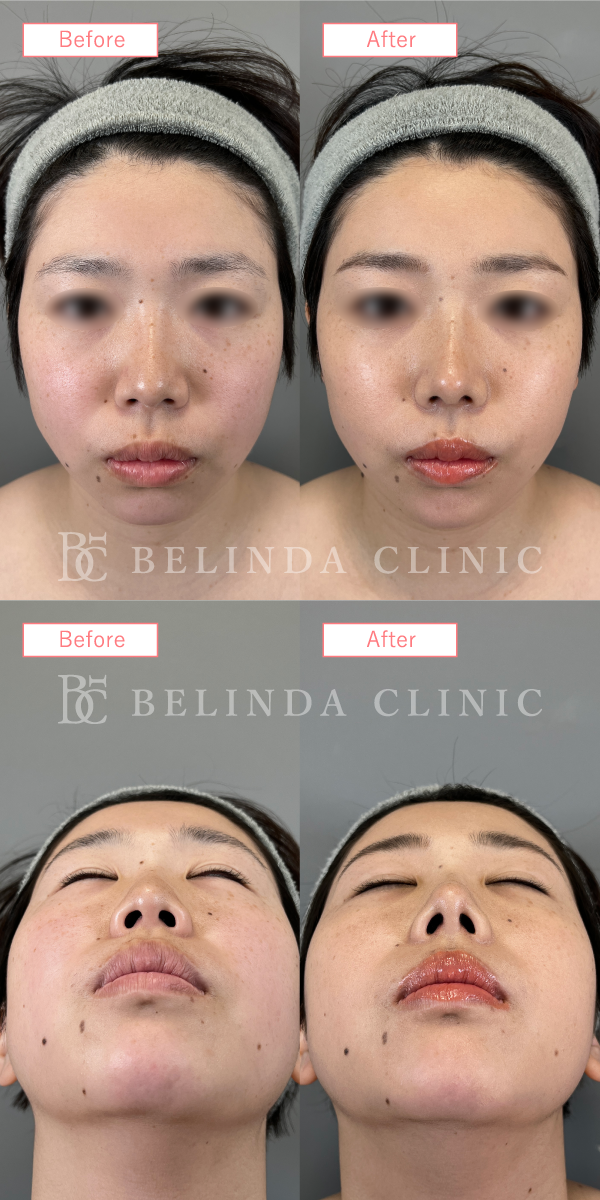 - 厚く丸みを帯びている鼻尖部(鼻先)を、切開や糸による埋没でシャープに整える施術です。団子鼻の解消や、鼻先を伸ばす治療の効果を高める際などに行われます。
