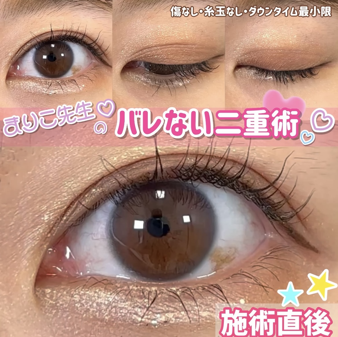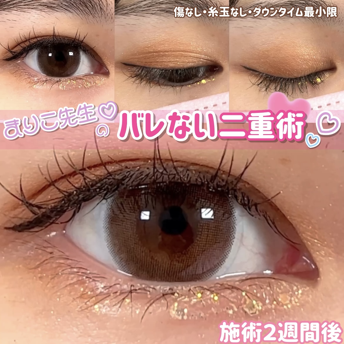 - まぶたの数カ所を専用の糸で結び留めることで二重のラインを作ります。切開と比べて傷跡は目立たず、腫れもダウンタイムも少ないのがメリット。